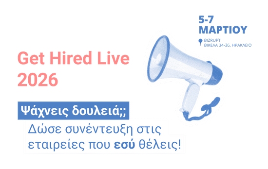 Get Hired Live, 5-7 Μαρτίου. Έχεις την ευκαιρία να γνωρίσεις καινοτόμες επιχειρήσεις που δραστηριοποιούνται στην Κρήτη, αλλά και στην υπόλοιπη Ελλάδα και να διεκδικήσεις μία από τις entry level θέσεις εργασίας μέσω της διαδικασίας άμεσης συνέντευξης. Δήλωσε συμμετοχή έως 27/02.